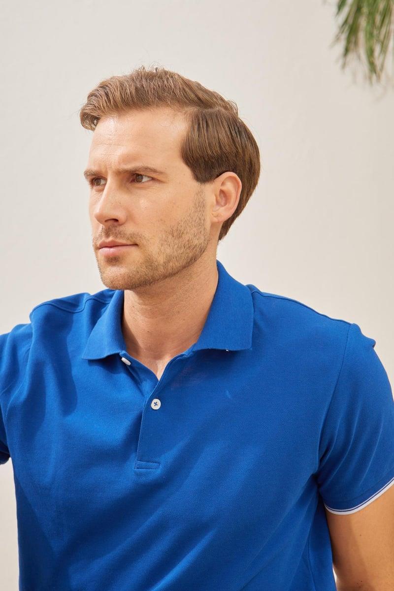İntersiye Yaka Detaylı Pamuklu Erkek Mavi Polo Yaka Tişört (Mars429)