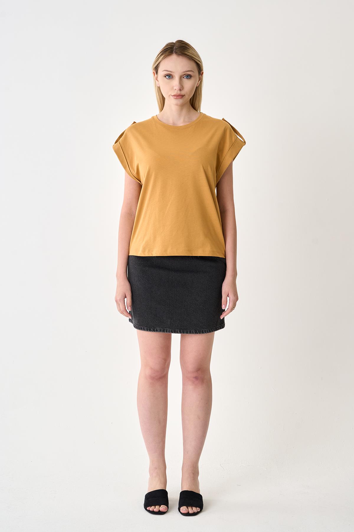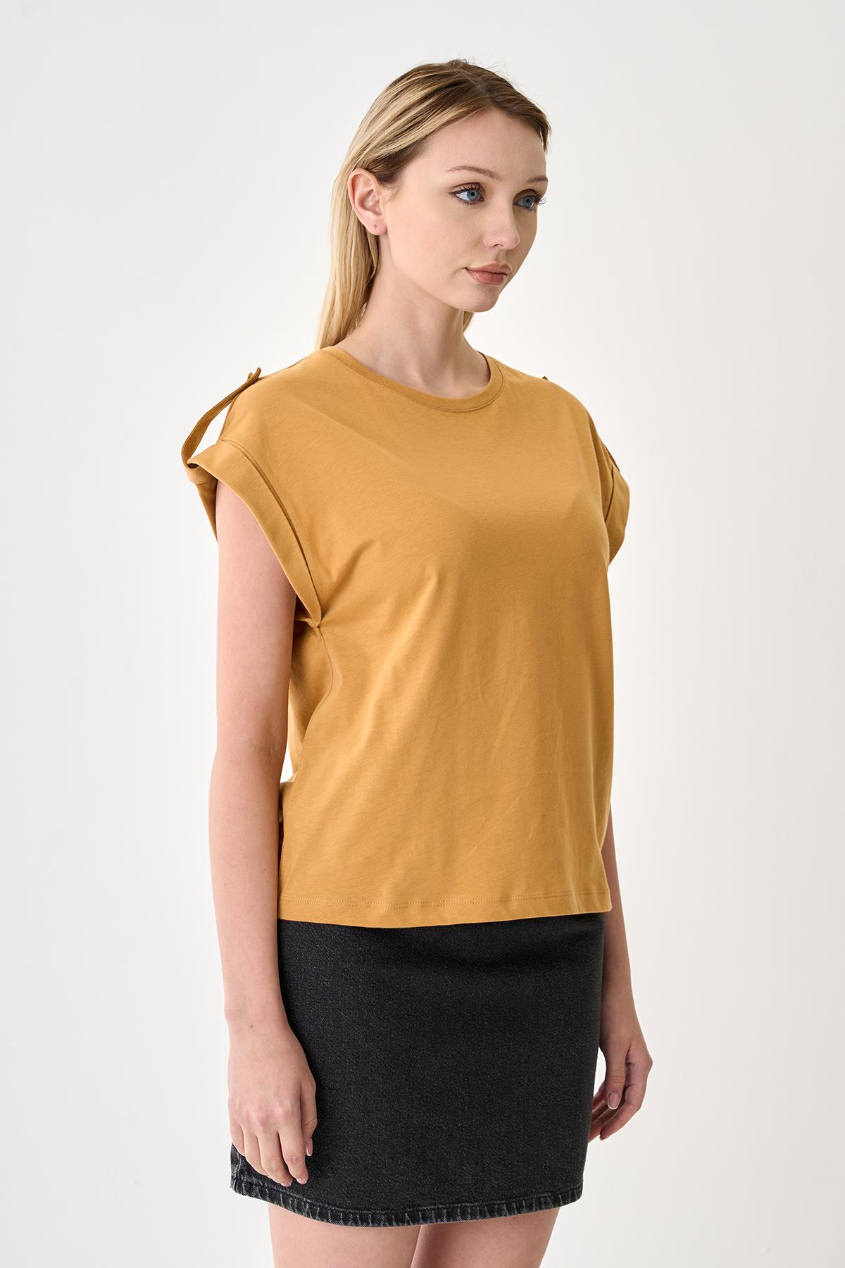 Kadın Apoletli %100 Pamuk Hardal Tişört, şıklığı ve rahatlığı bir arada sunar. Hardal rengin modern dokunuşunu yansıtan tasarımı, her türlü kombinle uyum sağlar. Pamuklu kumaşı sayesinde nefes alabilir ve hafif yapısı ile gün boyu konfor sunar. İster günlük kullanımda ister özel anlarda tercih edebileceğiniz bu tişört, rahat ve zarif bir stil için ideal bir seçenektir.