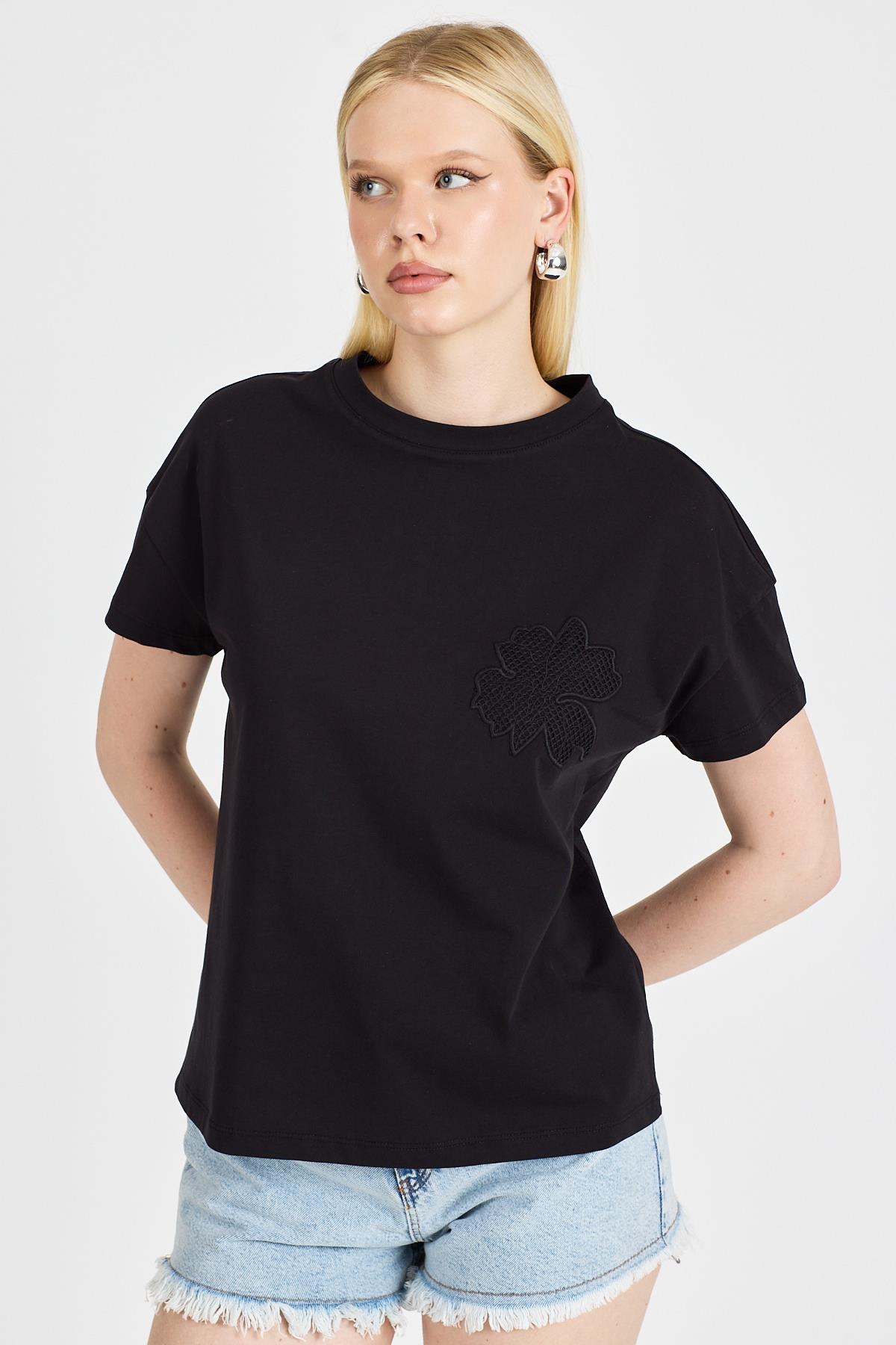 Kadın Dantel Nakışlı %100 Pamuk Siyah Tişört, şıklığı ve rahatlığı bir arada sunar. Siyah rengin modern dokunuşunu yansıtan tasarımı, her türlü kombinle uyum sağlar. Pamuklu kumaşı sayesinde nefes alabilir ve hafif yapısı ile gün boyu konfor sunar. İster günlük kullanımda ister özel anlarda tercih edebileceğiniz bu tişört, rahat ve zarif bir stil için ideal bir seçenektir.