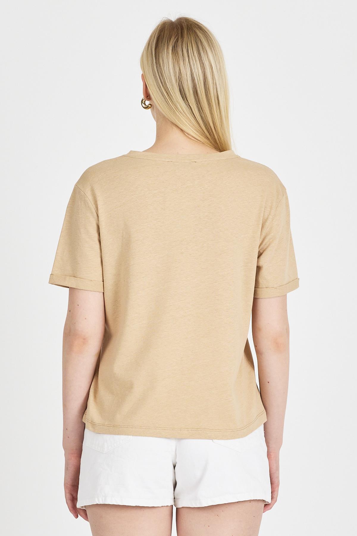 Kumaş Türü: Pamuklu Kumaş Renk: Bej Yaka Tipi: Bisiklet Yaka Kol Tipi: Kısa Kol Kalıp: Slim Fit Kalıp Cep: Cepsiz Desen: Düz Sezon: ilkbahar - Yaz Kullanılan Materyal: %100 Pamuk Yıkama Talimatları • 30 derecede yıkayınız. • Ağartıcı kullanmayın. • Orta ısıda kurutma makinesi kullanabilirsiniz. Tercihen sererek kurutun. • Yüksek ısıda ütüleme yapmayınız.