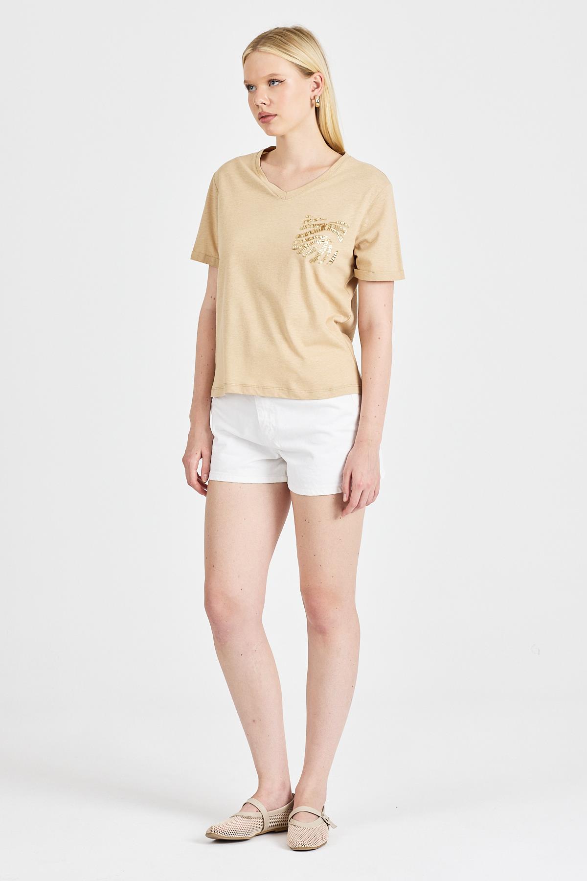 Kadın Payetli %100 Pamuk Bej Tişört, şıklığı ve rahatlığı bir arada sunar. Bej rengin modern dokunuşunu yansıtan tasarımı, her türlü kombinle uyum sağlar. Pamuklu kumaşı sayesinde nefes alabilir ve hafif yapısı ile gün boyu konfor sunar. İster günlük kullanımda ister özel anlarda tercih edebileceğiniz bu tişört, rahat ve zarif bir stil için ideal bir seçenektir.