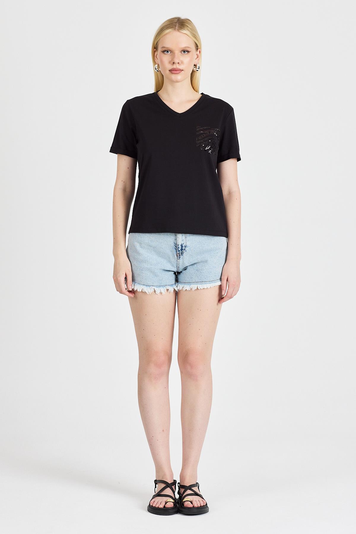 Kadın Payetli %100 Pamuk Siyah Tişört, şıklığı ve rahatlığı bir arada sunar. Siyah rengin modern dokunuşunu yansıtan tasarımı, her türlü kombinle uyum sağlar. Pamuklu kumaşı sayesinde nefes alabilir ve hafif yapısı ile gün boyu konfor sunar. İster günlük kullanımda ister özel anlarda tercih edebileceğiniz bu tişört, rahat ve zarif bir stil için ideal bir seçenektir.